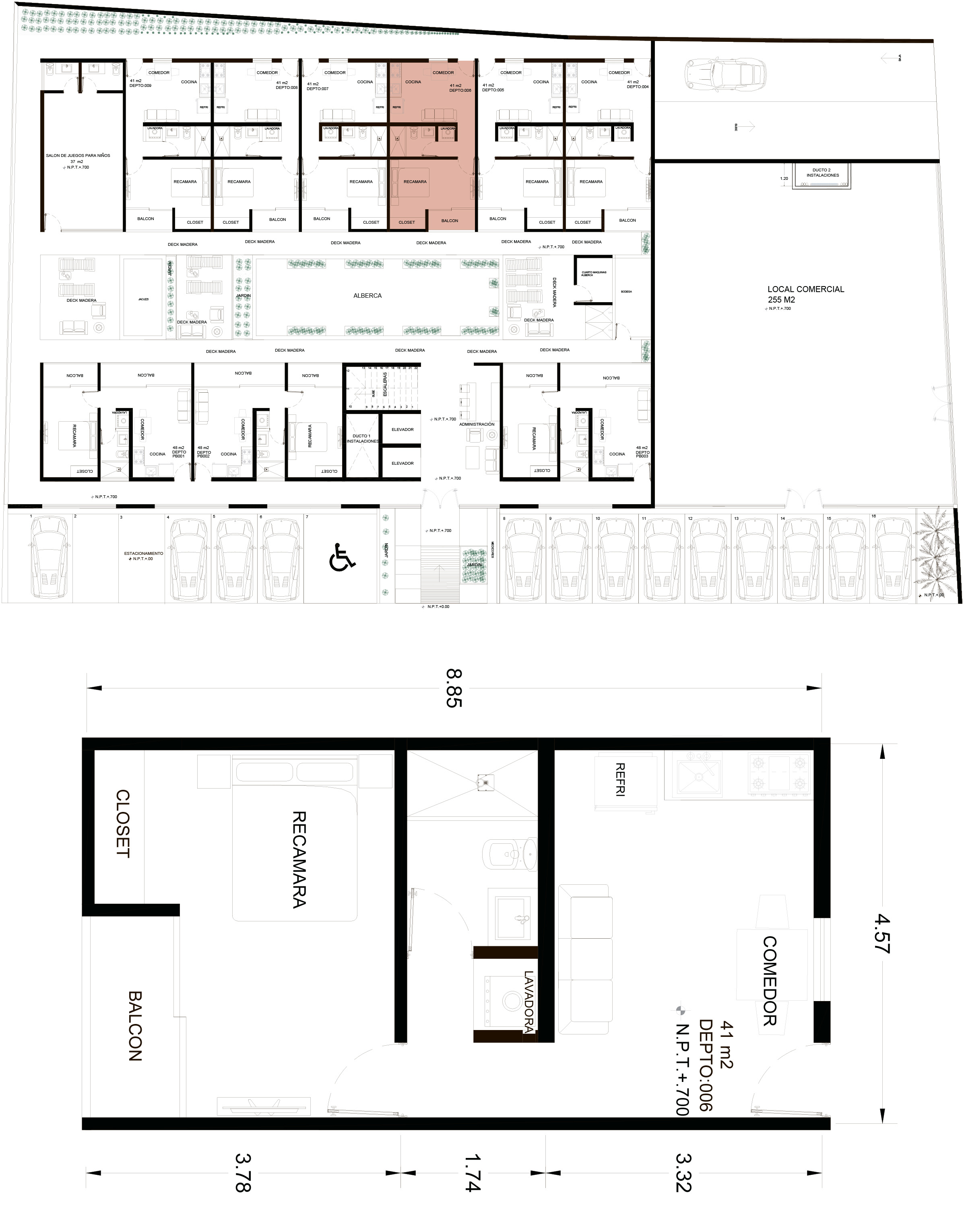 ☑ The apartment number 006 has 41m2, overlooking the common areas of Musa del Carmen, and has: